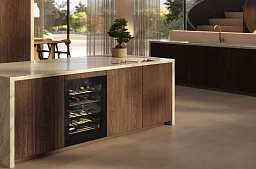 Встраиваемый винный холодильник Miele KWTUS 7096 E выполнен в благородном тоне «черный обсидиан», который придает меблированной нише современную сдержанность и визуальную глубину.