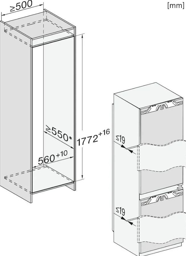 Встраиваемый холодильник Miele KFN 7774 B — это идеальное решение для тех, кто ценит качество и передовые технологии в бытовой технике. Белый корпус устройства гармонично впишется в любой интерьер, а компактные размеры позволят легко разместить его в нише шириной от 560 до 570 мм и высотой от 1772 до 1778 мм. Удобные дверные петли с системой SoftClose и SelfClose обеспечивают плавное и бесшумное закрытие, а технология жестких петель гарантирует надежность и долговечность.