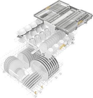 Система ComfortClose обеспечивает мягкое закрытие дверцы, а в завершение цикла она автоматически приоткрывается, гарантируя качественную сушку даже для пластиковой посуды. Внутреннее пространство машины рассчитано на 14 полных комплектов посуды, что делает ее весьма вместительной. Удобное размещение столовых приборов обеспечивается специальным поддоном 3D MultiFlex, а чашки можно легко разместить на специальных держателях.