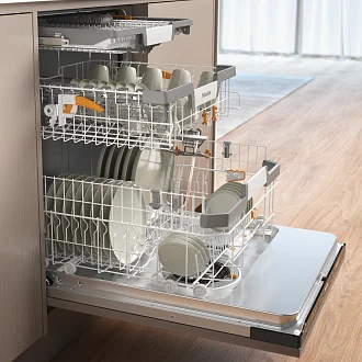 Полновстраиваемая посудомоечная машина Miele G 7655 SCVi XXL AutoDos — это высокотехнологичный прибор, разработанный ведущим производителем бытовой техники Miele. С шириной 60 см и размером XXL, эта модель идеально вписывается в любую кухню, обеспечивая эффективное использование пространства. Панель управления выполнена в стильном черном цвете обсидиана, что придает ей современный и элегантный вид. Управление осуществляется с помощью интуитивно понятного сенсорного дисплея с однострочным текстовым дисплеем белого цвета. Прибор поддерживает функцию MultiLingua, позволяющую выбирать язык дисплея, что делает его удобным для использования людьми, говорящими на разных языках. Одной из ключевых особенностей является автоматическое дозирование с PowerDisk, обеспечивающее оптимальное использование моющего средства. Модель также оснащена индикаторами контроля работы, наличия соли и отображением оставшегося времени, что облегчает процесс управления и контроля. Посудомоечная машина данного бренда AutoDos обладает классом энергоэффективности A и классом сушки A, что гарантирует экономичность и высокую производительность. Дополнительные функции, такие как FlexiTimer с Eco-запуском, EcoFeedback и технология EcoPower, обеспечивают дополнительную экономию энергии и воды. Модель также поддерживает подключение горячей воды через ThermoSave® и функцию половинной загрузки, что позволяет оптимизировать энергопотребление. Система сушки AutoOpen, SensorDry и активная конденсационная сушка гарантируют отличные результаты сушки. Благодаря функции BrilliantGlassCare посуда всегда будет выглядеть как новая. Разнообразие программ мойки, включая QuickPowerWash, ComfortWash 45 °C, ComfortWash+ 55 °C, PowerWash, интенсивную 75 °C, деликатную и экстра тихую 37 дБ(А), позволяет выбрать наиболее подходящий режим в зависимости от типа и степени загрязнения посуды. Эта техника произведена в Чехии и обеспечивает надежную работу на протяжении долгого времени.