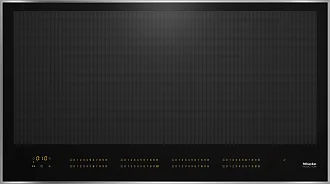 Индукционная панель имеет стальную рамку и применяет технологию FullSurface, которая автоматически определяет размер и положение посуды. При перемещении посуды на панели зажигаются индикаторы, показывая уровень мощности, соответствующий размещению кастрюль и сковород. Мощность можно регулировать от 1 до 9, включая функции Booster и Stop&Go, а также функцию поддержания тепла и таймер на 99 минут.